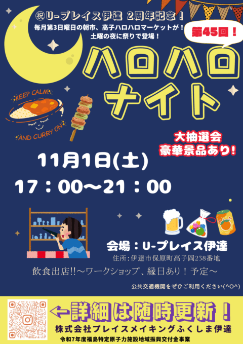 11月1日(土) 高子ハロハロナイト! Uープレイス伊達の2周年を記念致しまして、夜に開催致します! 日頃の感謝を込めて大抽選会...
